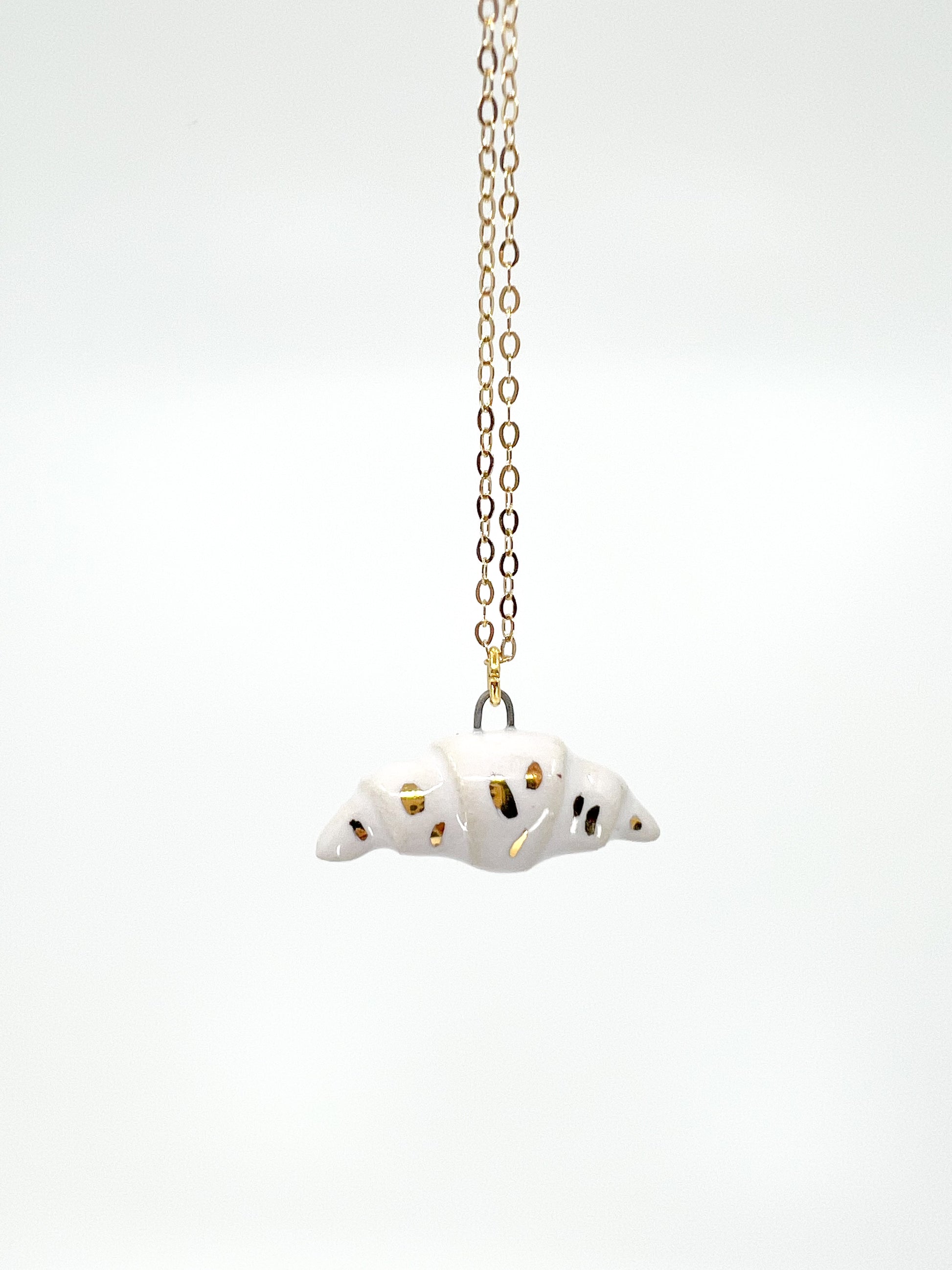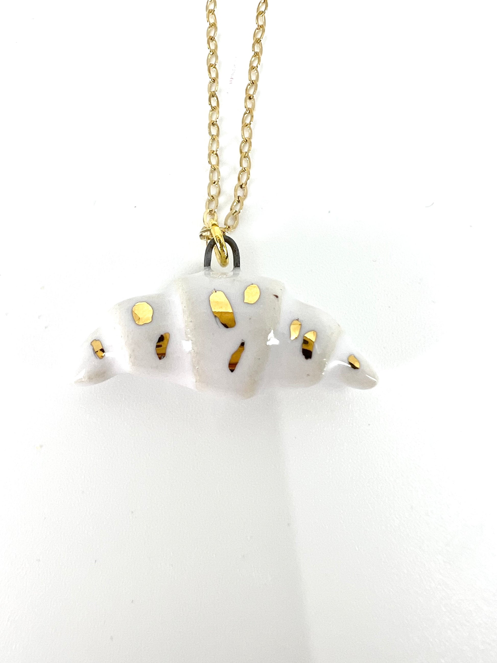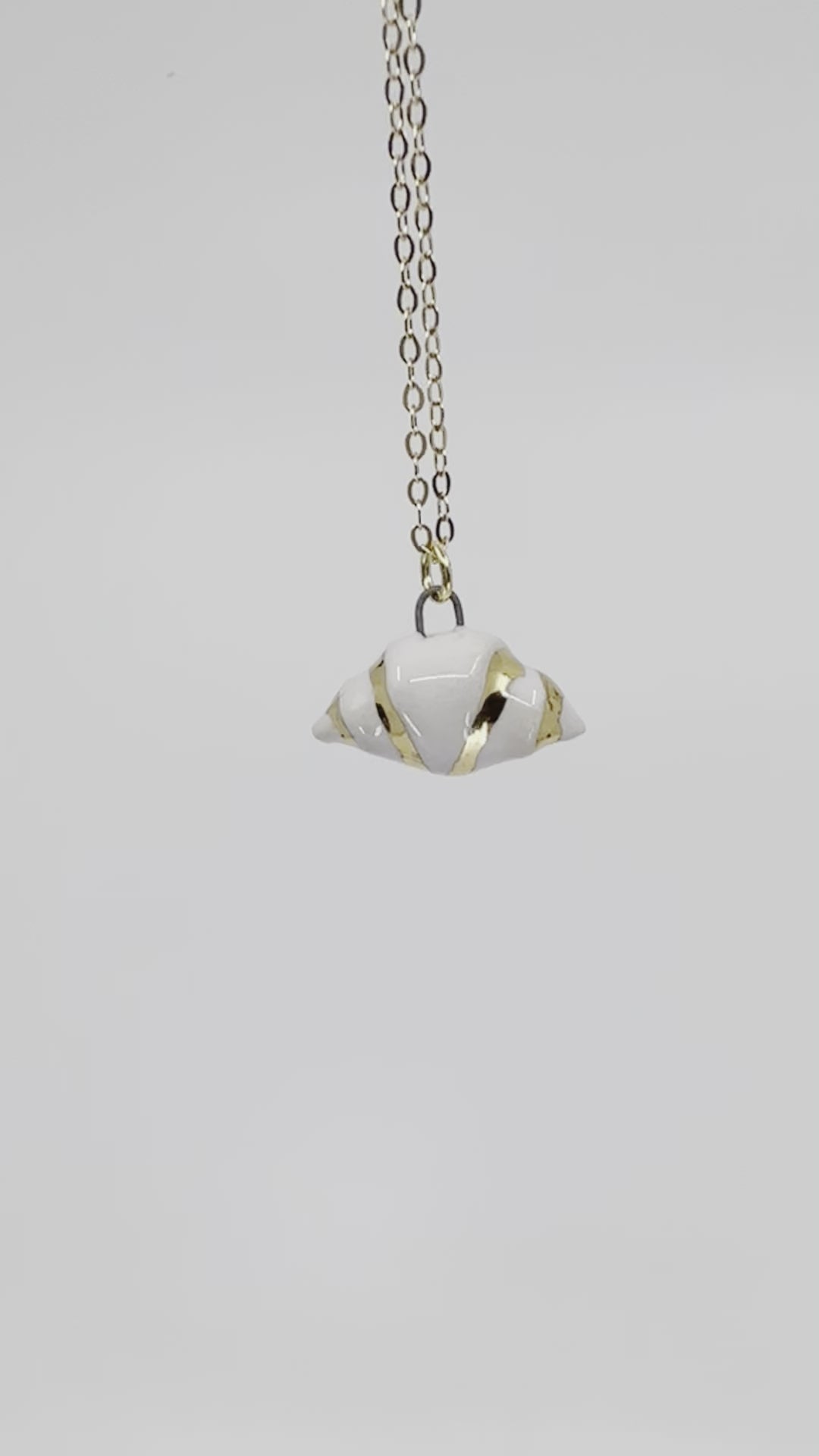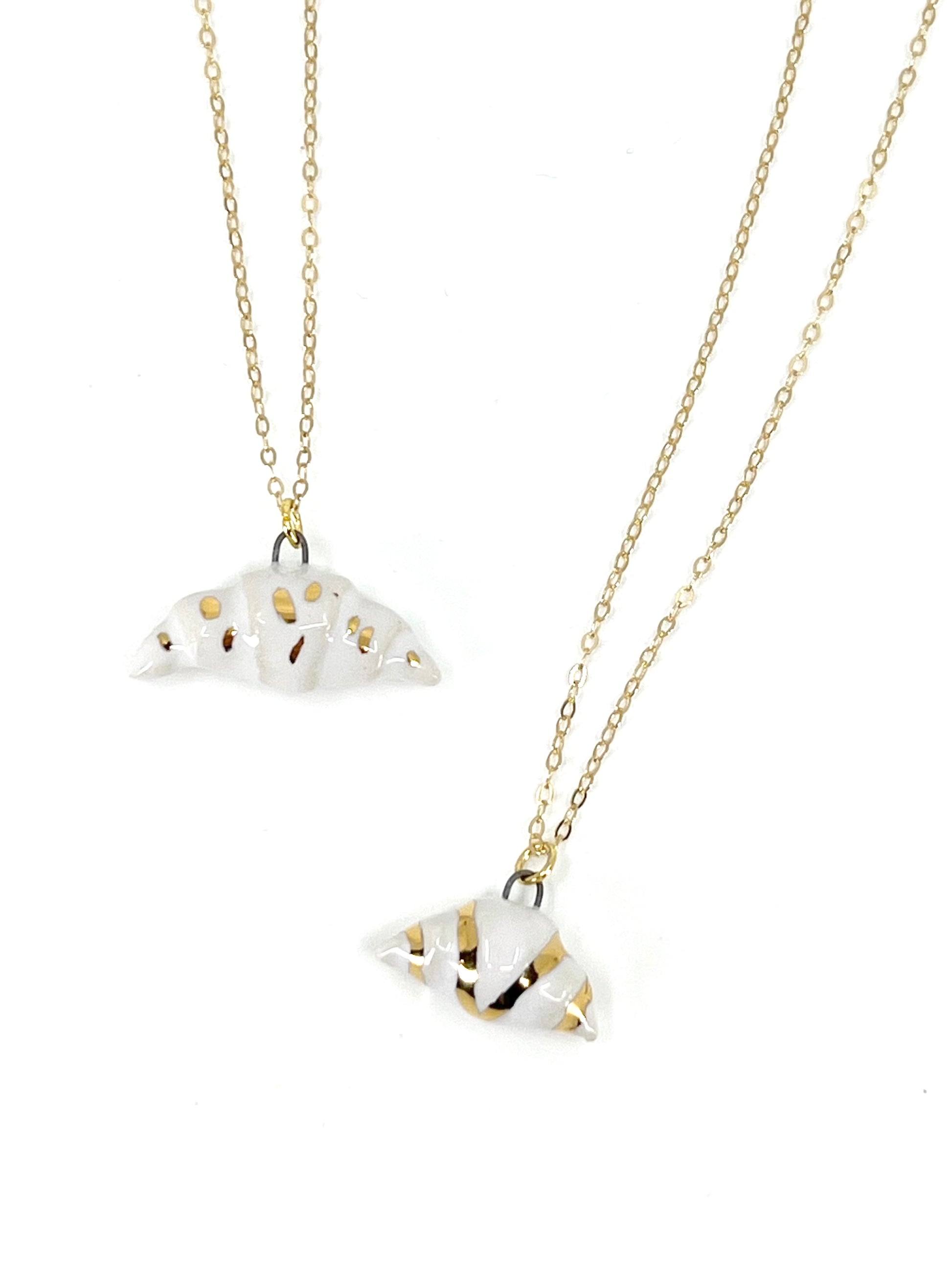 Each pendant is formed in clay by hand (no cookie cutters here!) and then decorated with a white glossy glaze. A 22K gold lustre is then applied on top (that’s three firings in the kiln if you’re keeping track!)