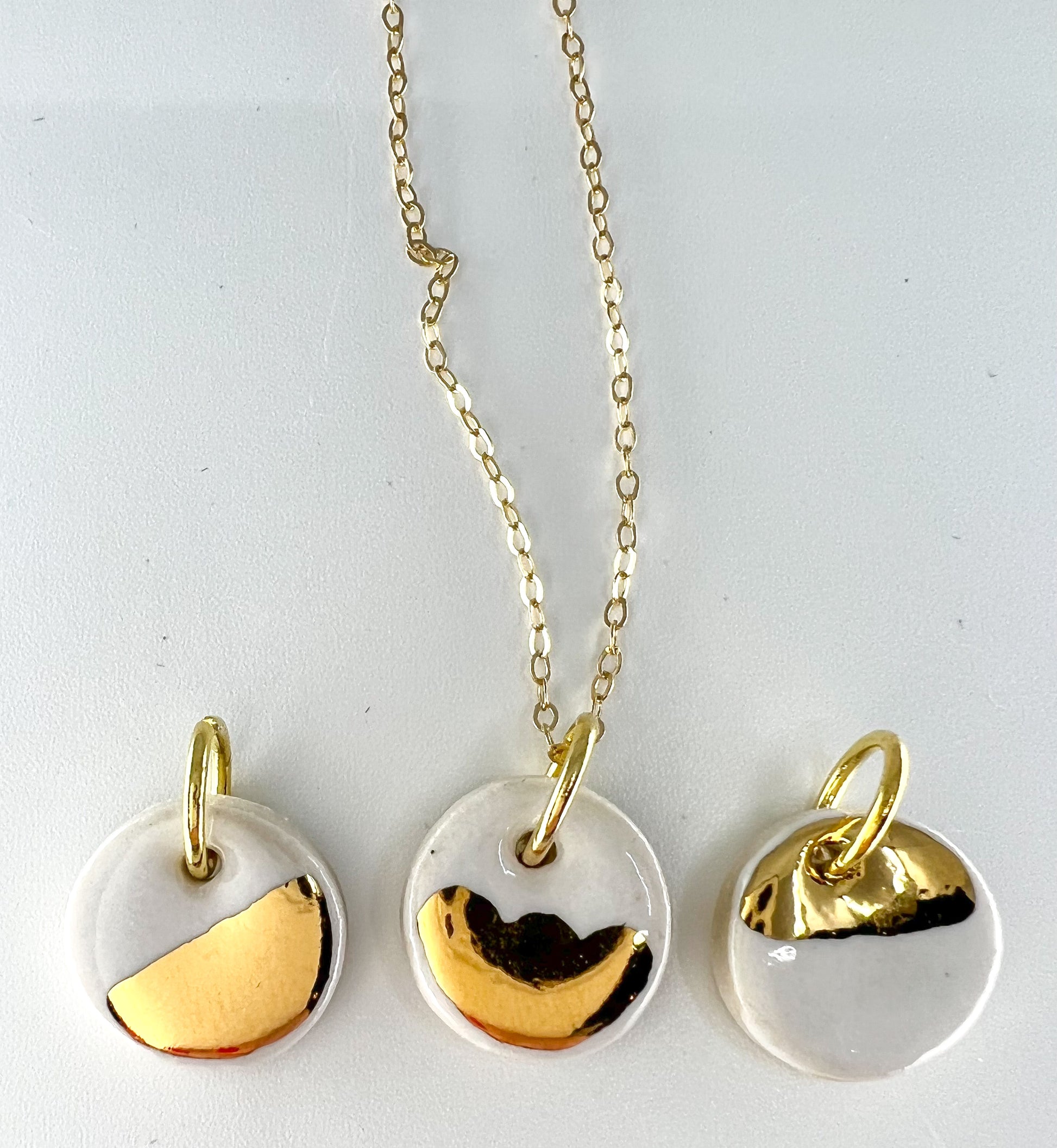 Chains are 18” long and gold plated. Unfinished clay back.
