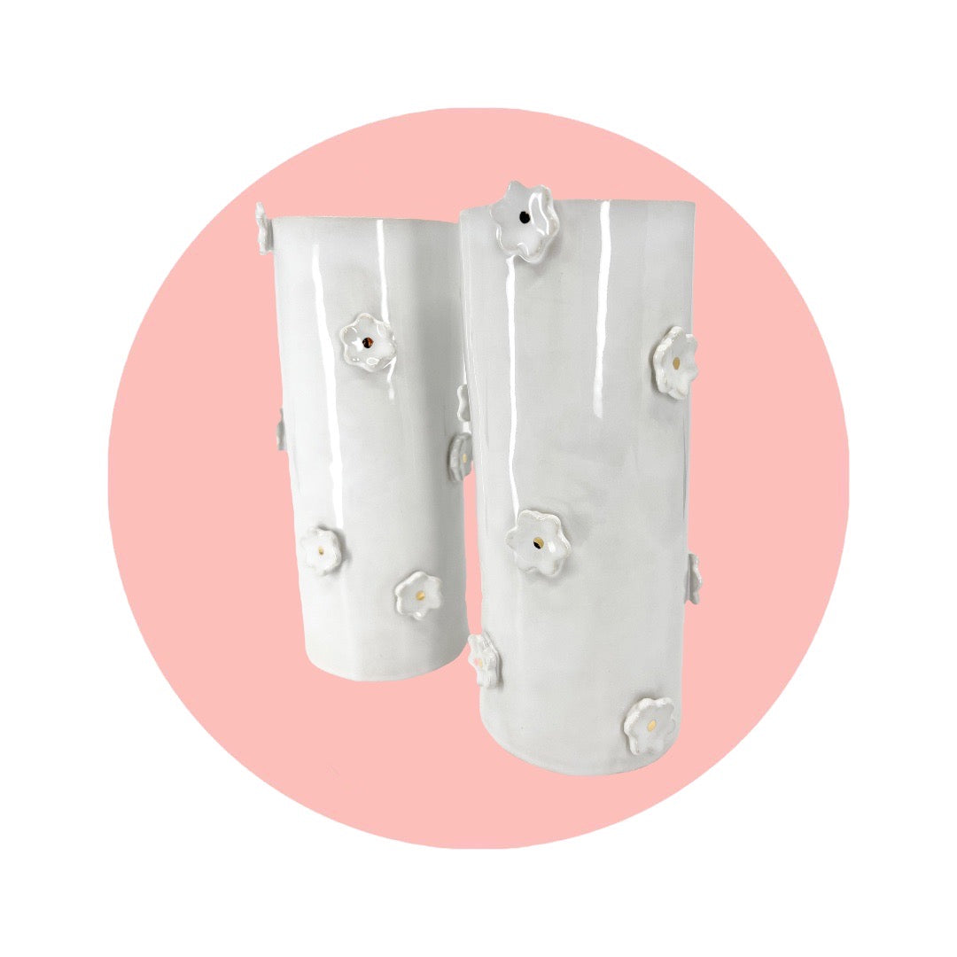 Ceramic blooms dance all around these sweet little hand built vases.