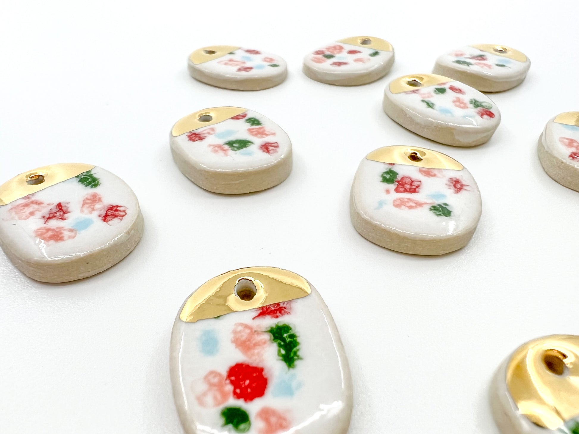 White glossy glaze with hits of pink, red, blue and green, topped with 22K gold. Pendant is on an 18" gold plated chain with a gold plated hoop. Unfinished clay back.