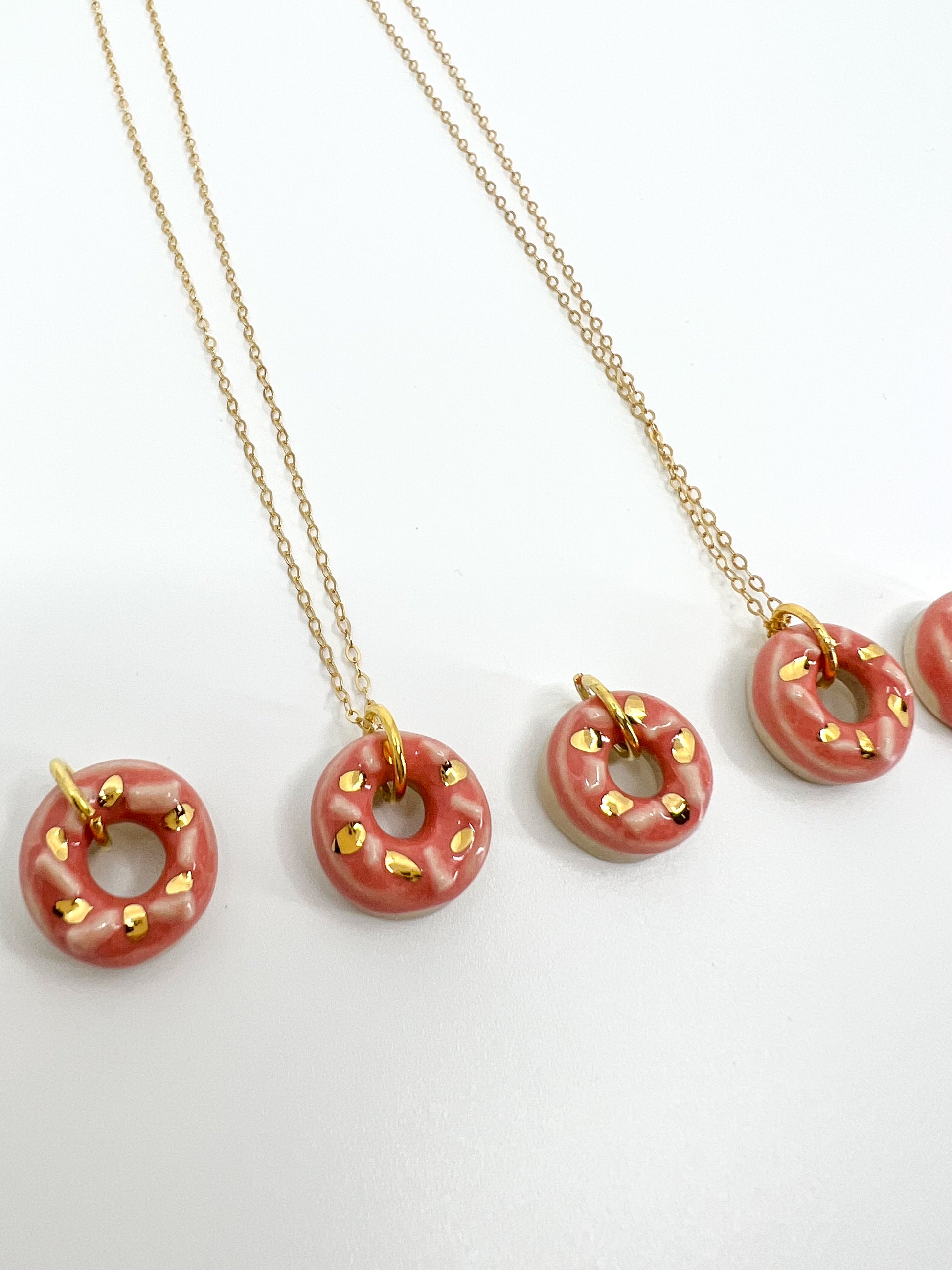 Pink glossy glaze with white and 22K gold sprinkles. Pendant is on an 18" gold plated chain with a gold plated hoop. Unfinished clay back.