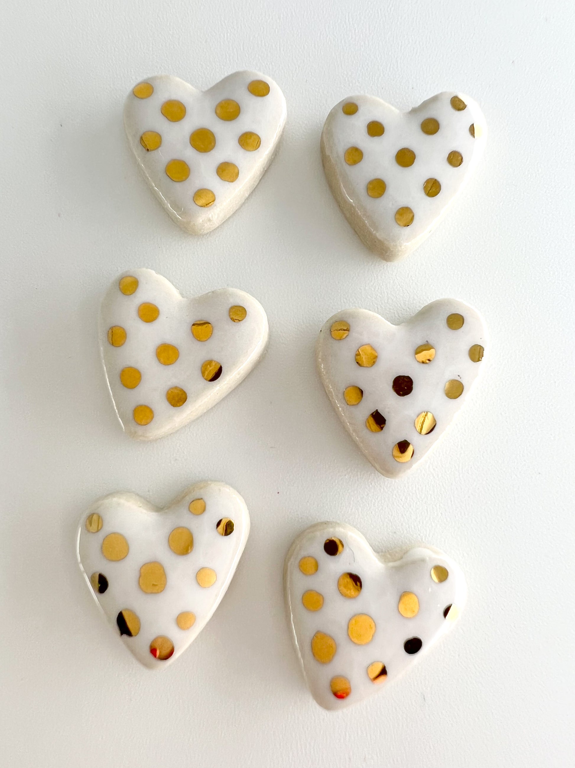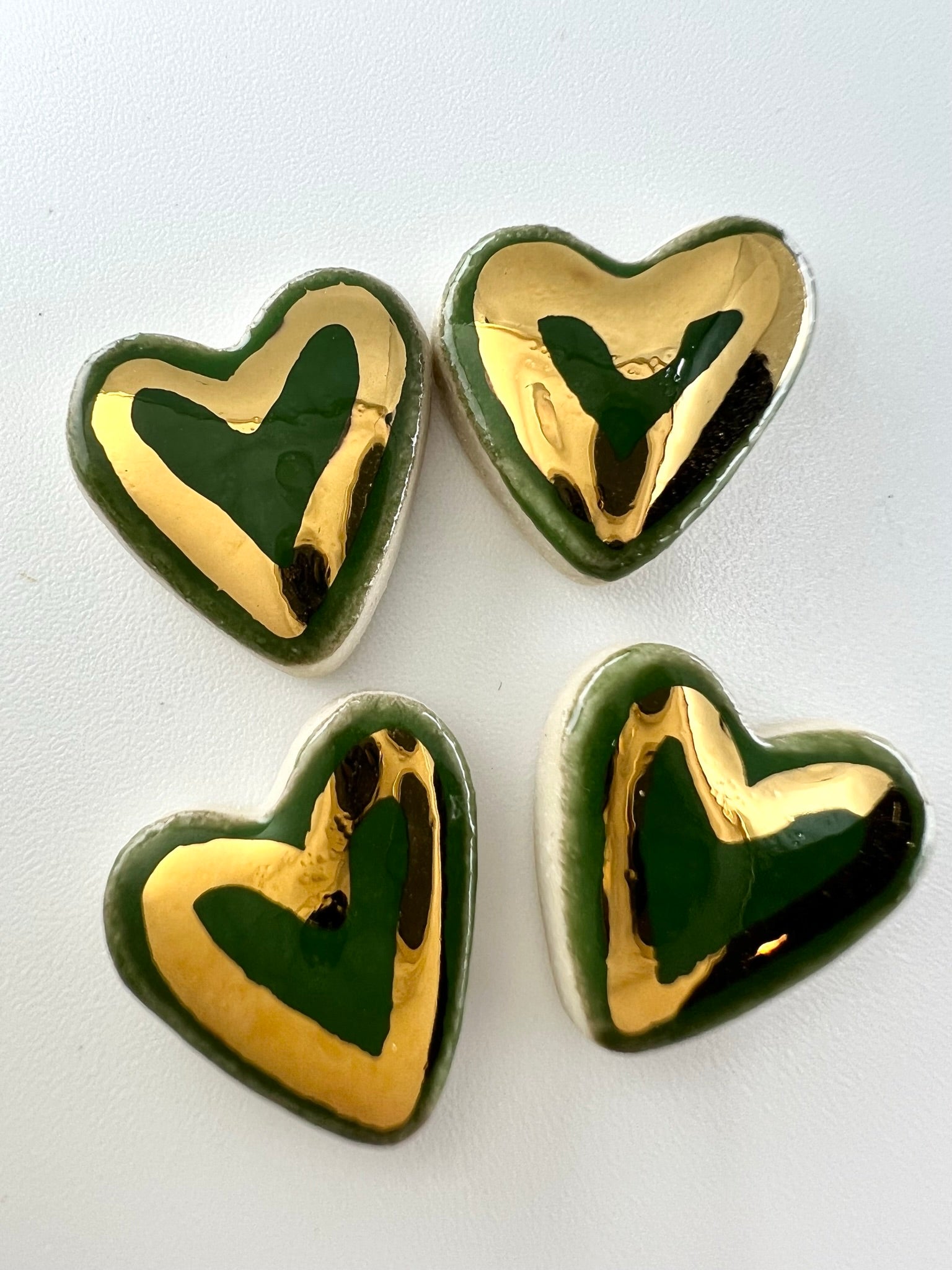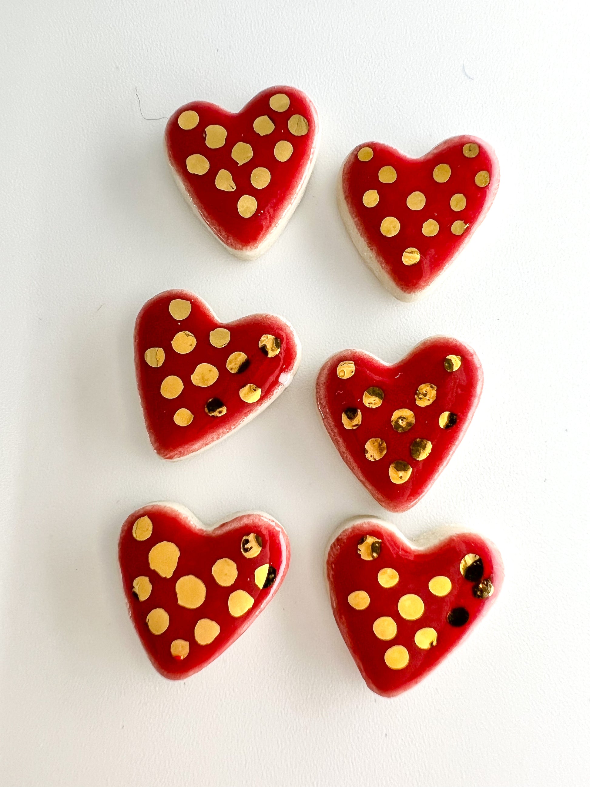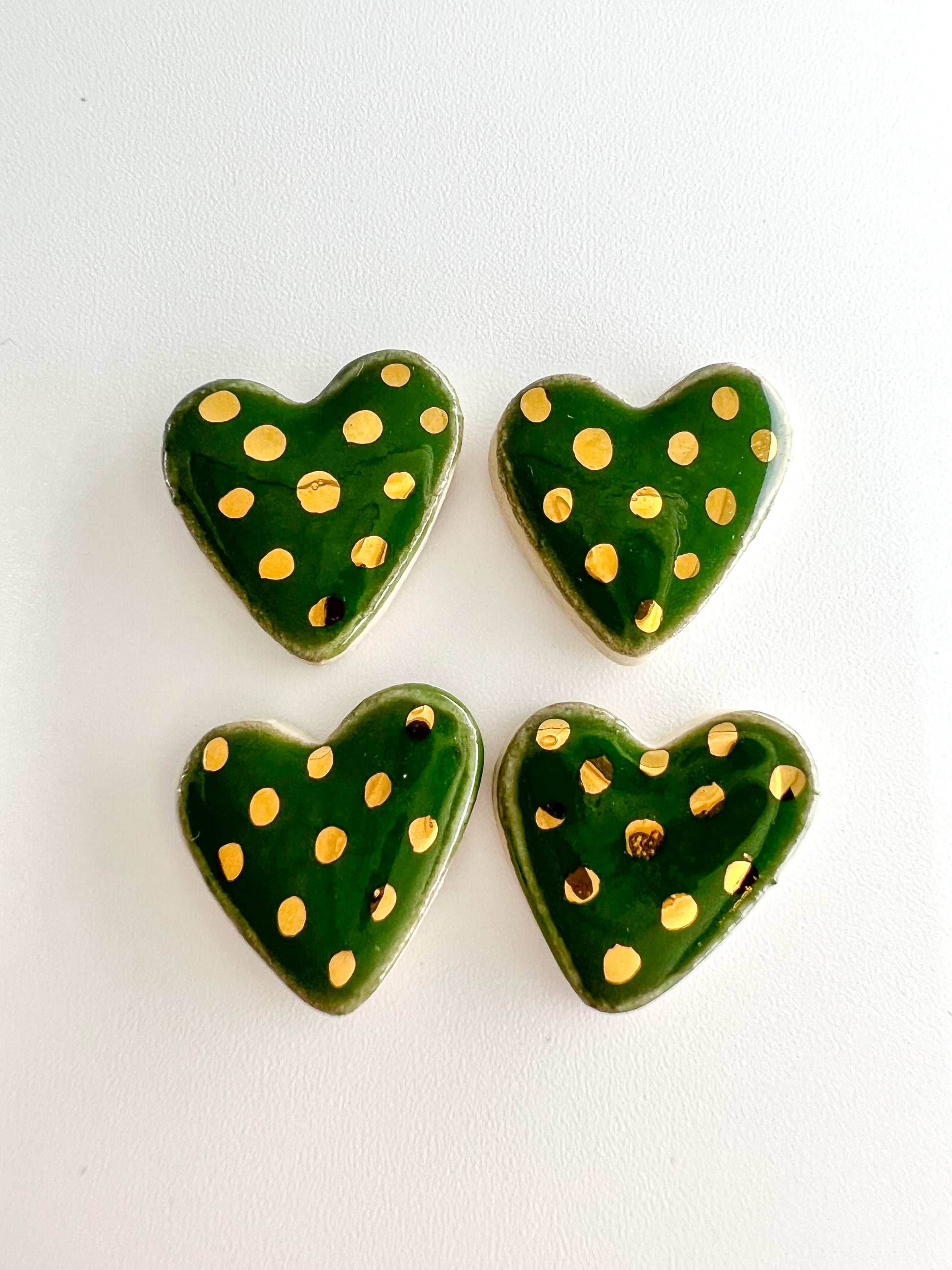 Even so, we have taken the hearts we usually affix to our vases and made some cute little ceramic studs out of them. Each earring is made from clay by hand. We fire them with a glossy glaze then put them in a kiln for a third time with a 22K gold lustre just to fancy them up a bit!
