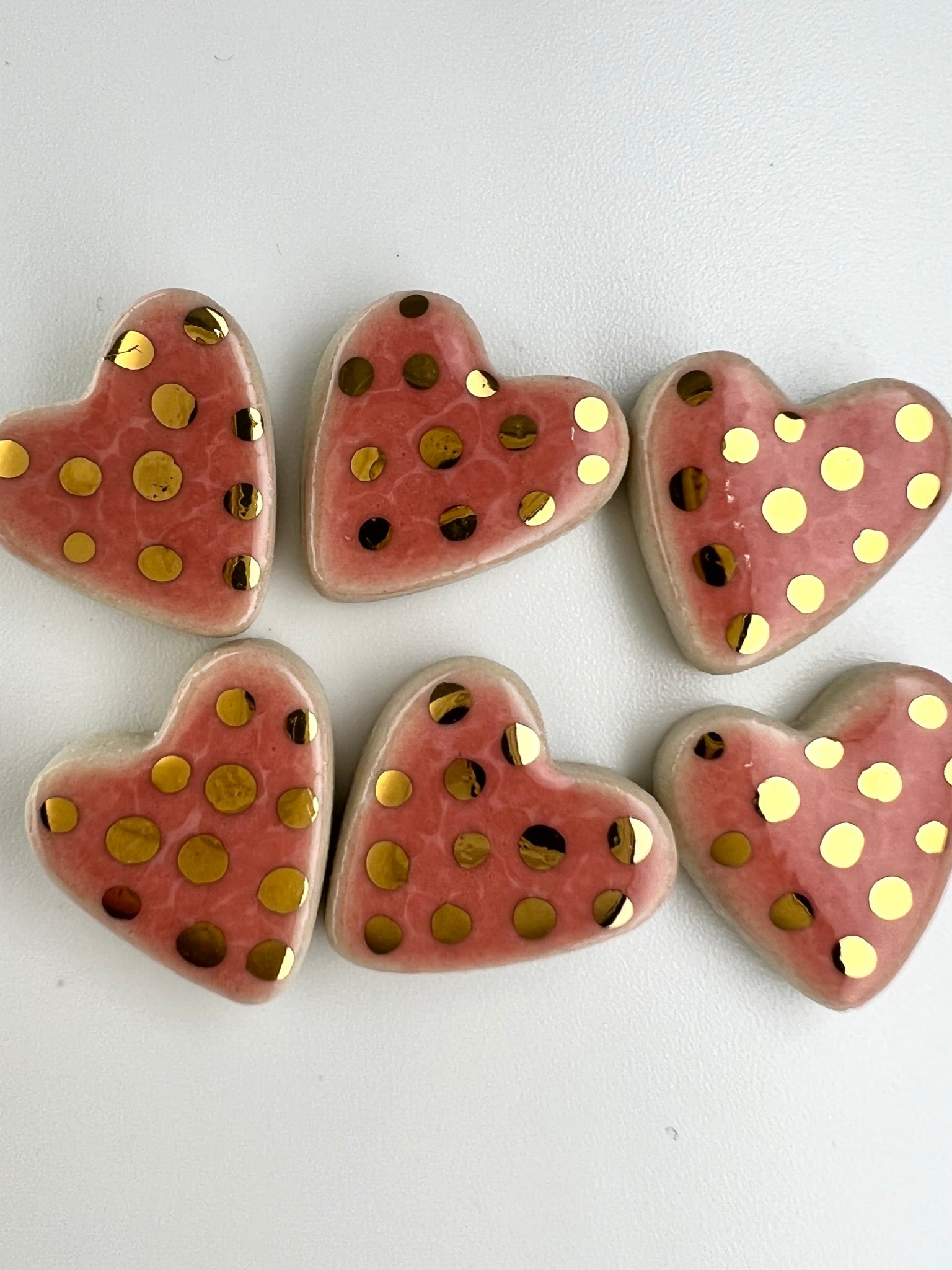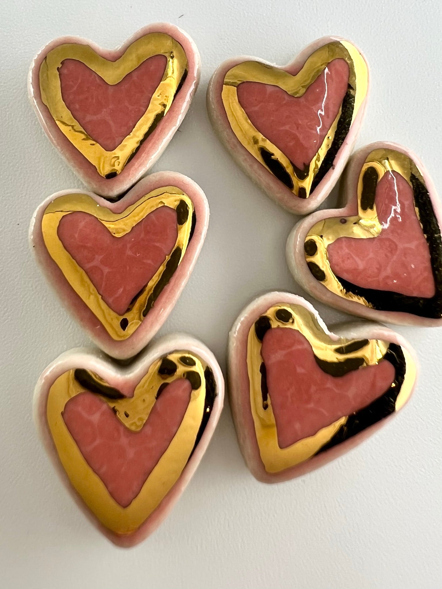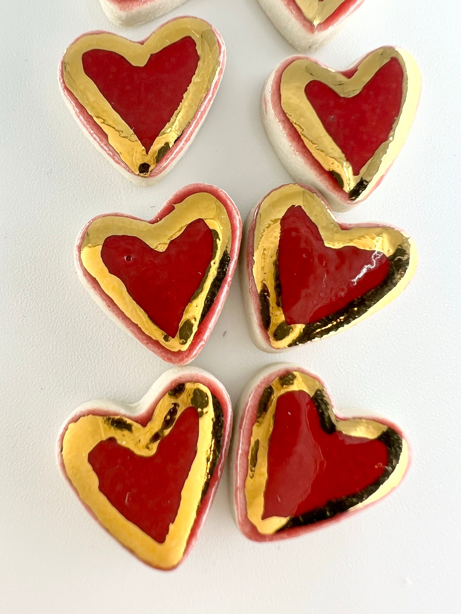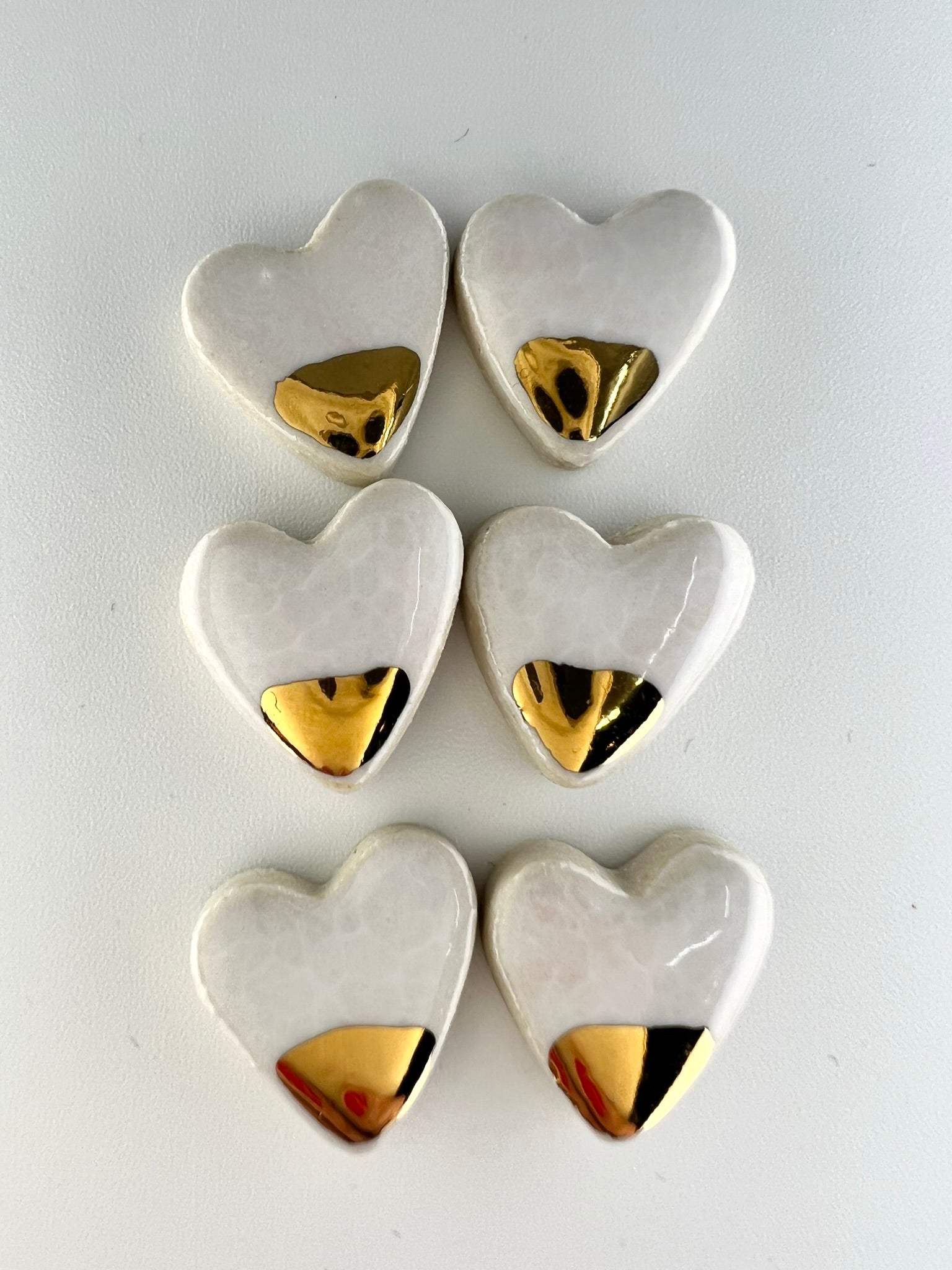 Even so, we have taken the hearts we usually affix to our vases and made some cute little ceramic studs out of them. Each earring is made from clay by hand. We fire them with a glossy glaze then put them in a kiln for a third time with a 22K gold lustre just to fancy them up a bit!