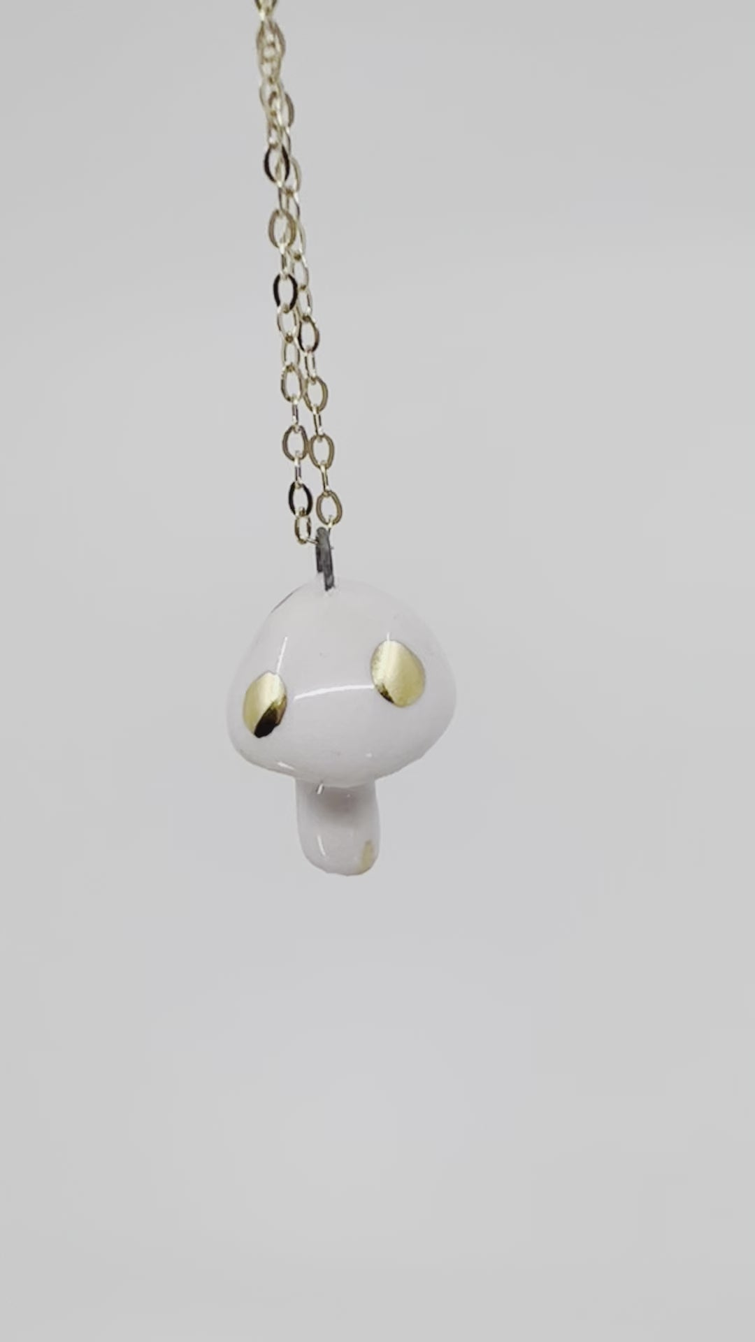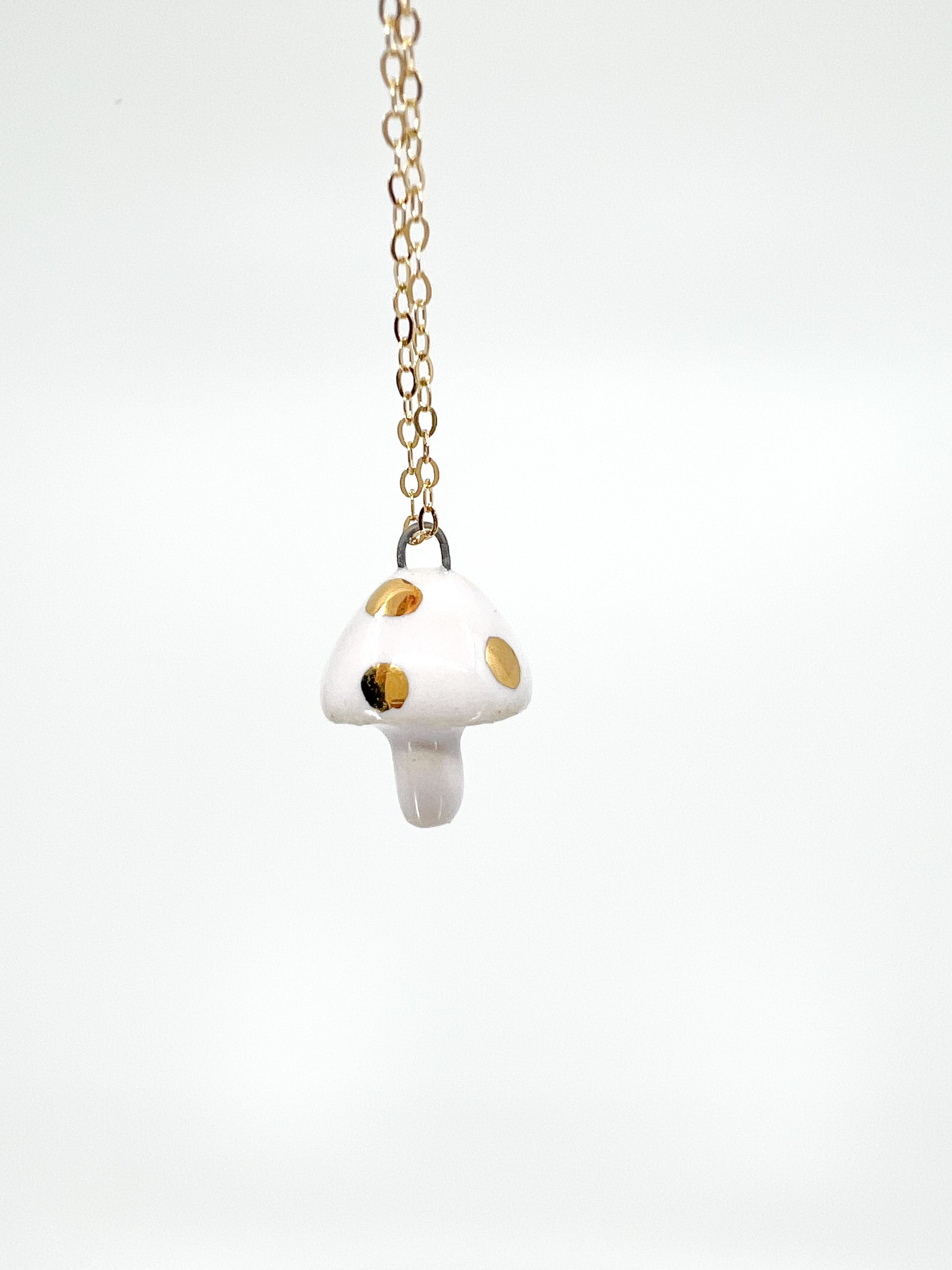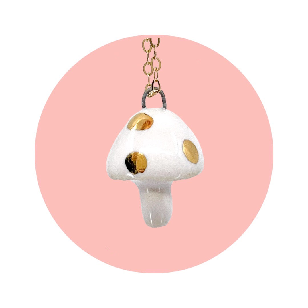 Each pendant is formed in clay by hand (no cookie cutters here!) and then decorated with a white glossy glaze. A 22K gold lustre is then applied on top (that’s three firings in the kiln if you’re keeping track!)