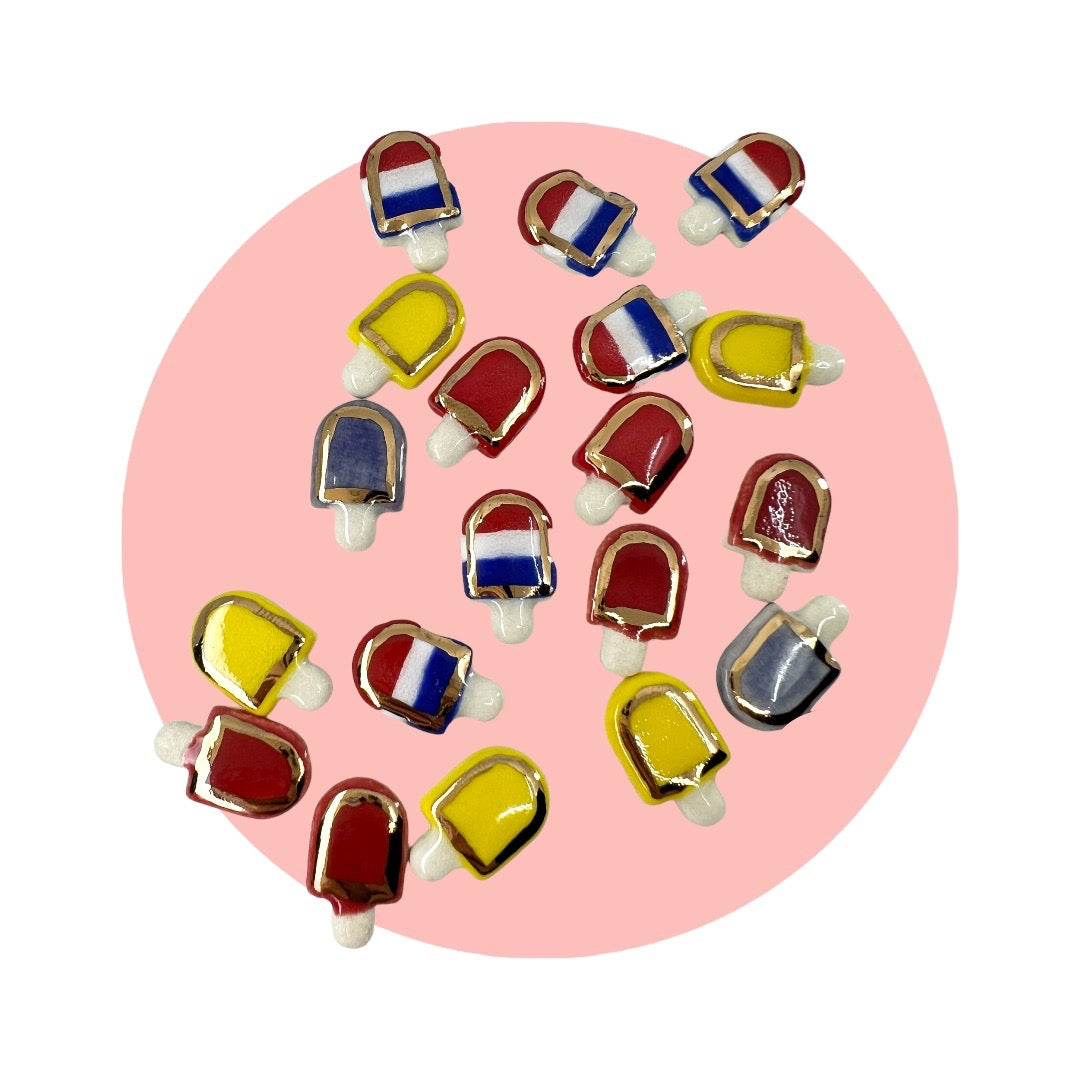 Chill out with these Popsicle Pete Studs! (does anyone else remember that jingle?) Retro popsicle designs decorated with 22K gold details. Available in all of the best flavours.