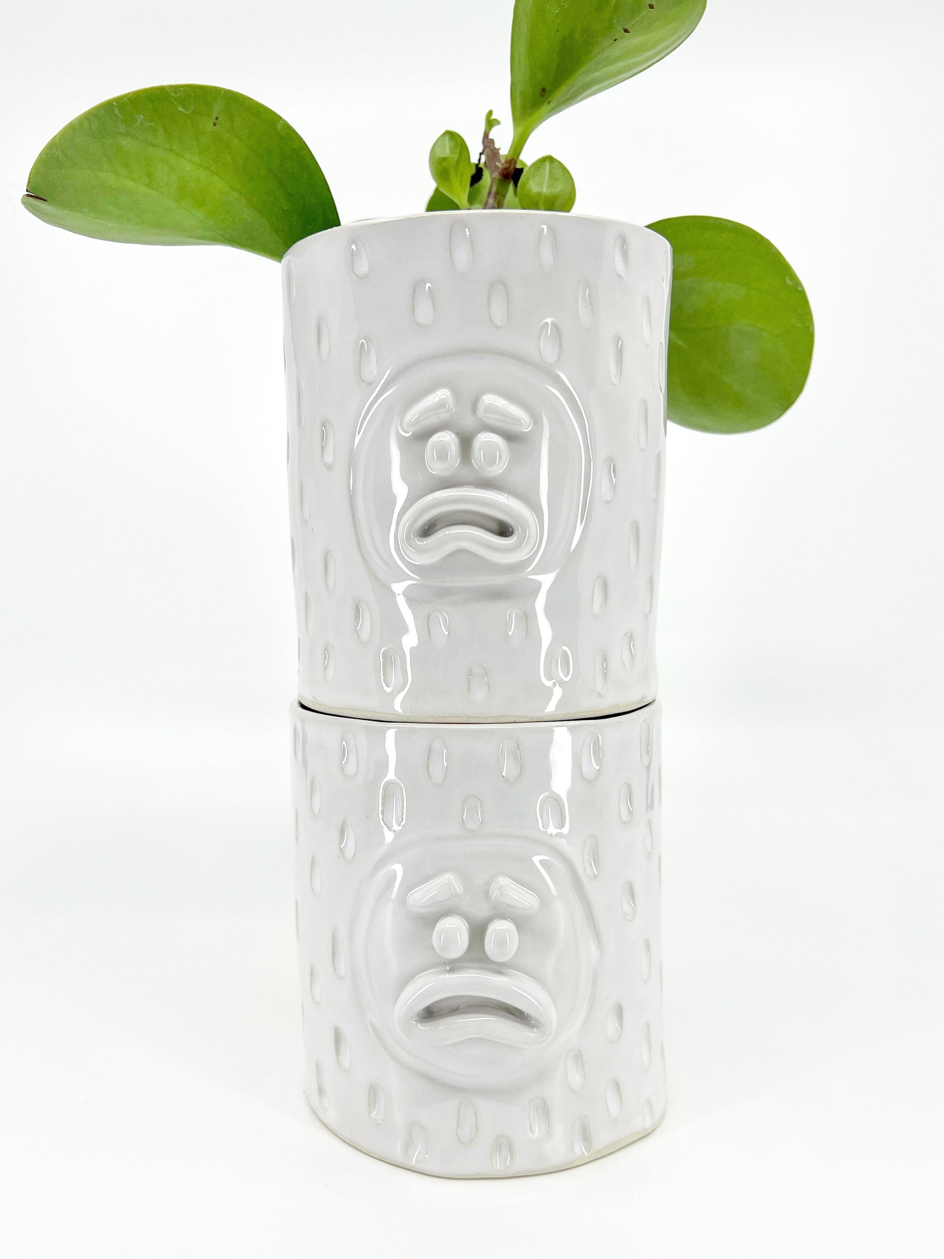 All of our ceramic planters are hand built, which means they each have their own lumps, bumps and ridges. Each face is unique (but equally pouty) and each pot is hand carved the full way around. They are perfectly imperfect, much like the humans they are molded after.